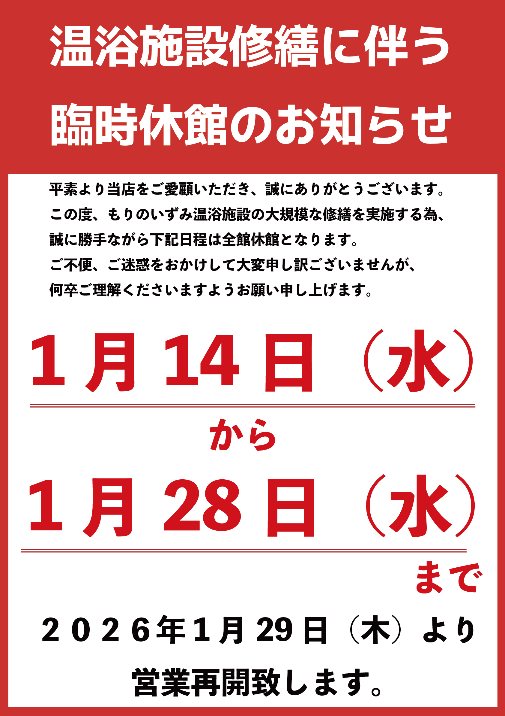 この度、もりのいずみ温浴施設の大規模な修繕を実施する為、