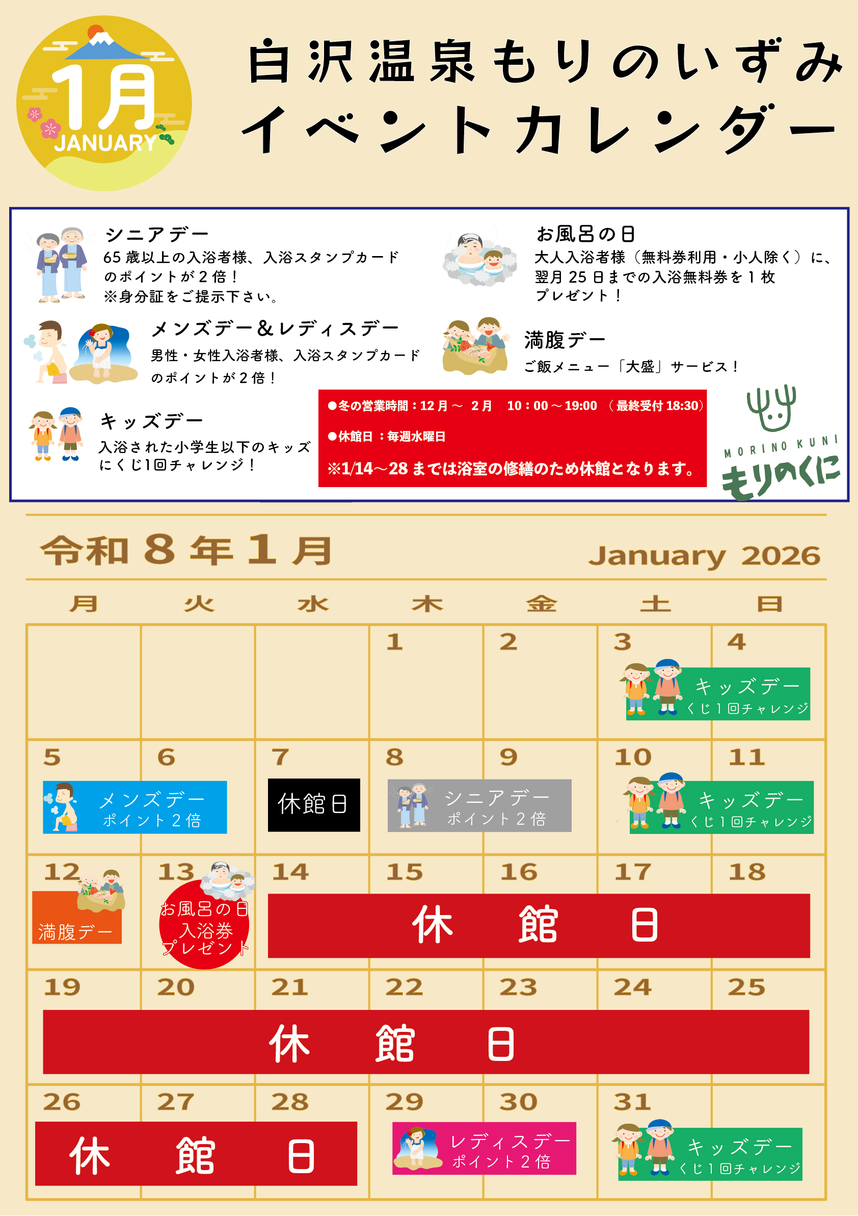 1/14(水)から28(水)まで、温泉の大規模修繕があり臨時休館となります。