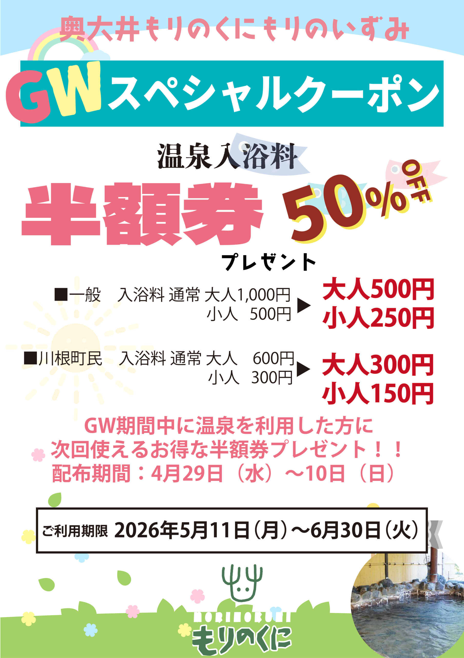 ※半額券は期間中に温泉をご利用いただいた方へ配布いたします。